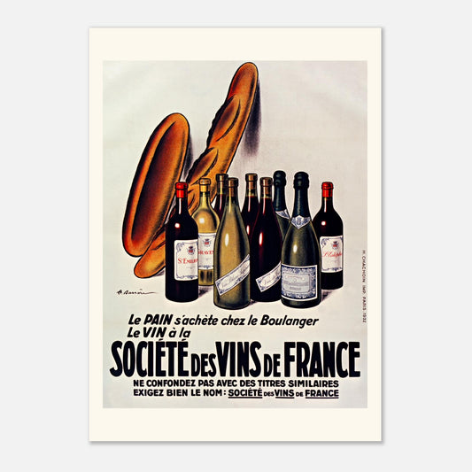Affiche vintage originale : Société des Vins de France – Le pain chez le boulanger, le vin...