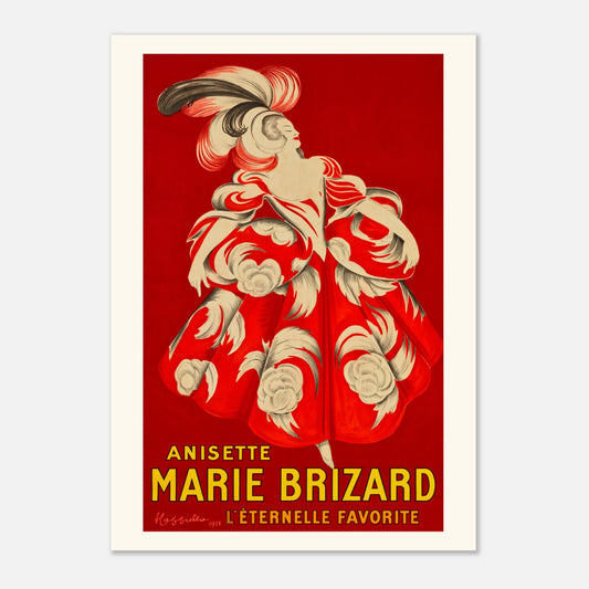 Cette reproduction d'affiche vintage présente une publicité élégante pour l'Anisette Marie Brizard, une liqueur célèbre, sous le slogan "L'éternelle favorite". L'affiche, réalisée par Leonetto Cappiello en 1928, met en scène une femme majestueuse, vêtue d'une robe somptueuse aux motifs tourbillonnants de blanc et de gris sur un fond rouge éclatant. Sa tenue extravagante, ornée de grandes plumes, incarne le glamour et la sophistication de l'époque. Les formes fluides de la robe et les courbes gracieuses du personnage attirent le regard et évoquent un sentiment de mouvement et de théâtralité.