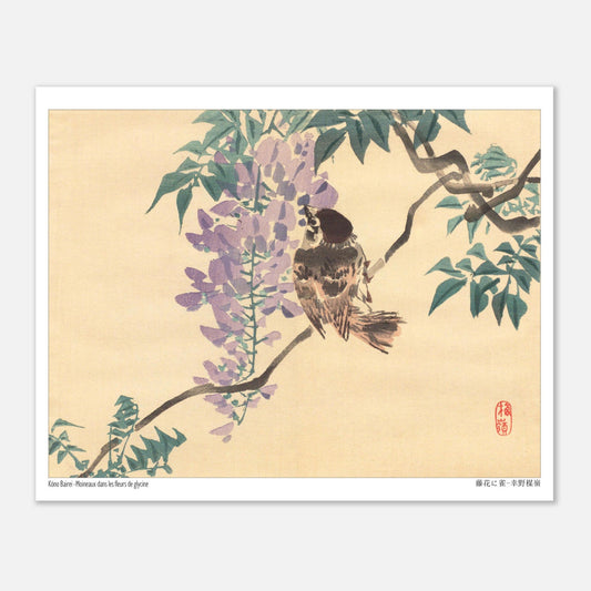 « Moineaux dans les fleurs de glycine » (titre original: 藤花に雀) est une estampe du peintre et illustrateur japonais Kōno Bairei (1844-1895).