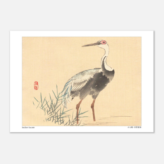 Cette estampe japonaise représente une grue majestueuse, souvent vue comme un symbole d'amour et de fidélité, illustrée dans un cadre naturel élégant.