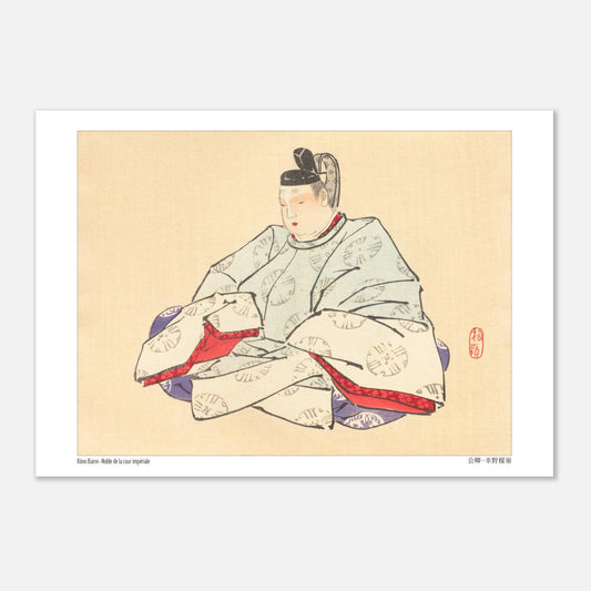 Cette estampe japonaise représente un noble de la cour impériale, vêtu de robes traditionnelles, symbolisant le pouvoir, la culture et le raffinement de la cour japonaise.