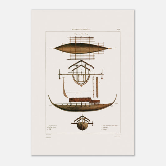 Découvrez cette évocation saisissante d’une grande pirogue, ou corocore, du hâvre Dorey, capturée par François Edmond Pâris lors de son passage en Nouvelle-Guinée avec l’Astrolabe. Imposante et élégante, cette embarcation se distingue par sa coque allongée, ses balanciers stabilisateurs et ses voiles finement travaillées, conçues pour optimiser vitesse et maniabilité. Chaque élément, des ornements sculptés aux amarrages soignés, illustre le savoir-faire exceptionnel des habitants de la région, mêlant esthétique et efficacité. Ce corocore reflète une tradition maritime profondément ancrée, révélant l’ingéniosité de ses bâtisseurs face aux exigences des eaux de Nouvelle-Guinée.