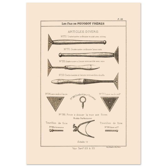 Explorez une sélection d'outils spécialisés du XIXe siècle avec cette reproduction d'une planche originale du catalogue Les Fils de Peugeot Frères (1885). Cette illustration présente des grattes-navires, lames, tirefonds et tourillons, outils indispensables pour les artisans de l'époque.