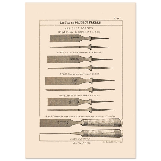 Plongez dans l'artisanat traditionnel du XIXe siècle grâce à cette reproduction d'une planche originale du catalogue Les Fils de Peugeot Frères (1885). Cette illustration met en avant une gamme complète de ciseaux de menuisier forgés, outils essentiels pour les artisans travaillant le bois.