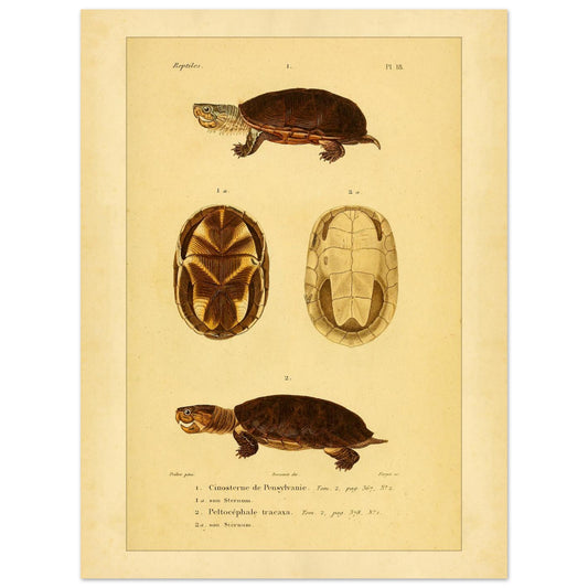 Cette reproduction scientifique présente deux espèces de tortues : le Cinosterne de Pensylvanie et le Peltocéphale tracaxa. La planche détaille chaque spécimen, y compris des vues spécifiques de leur sternum, offrant un aperçu anatomique précis pour l'identification et l'étude.