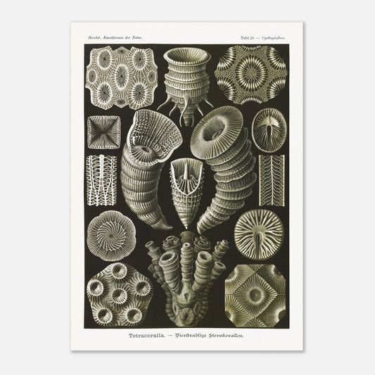 Les figures de cette planche représentent en grandeur naturelle (en partie avec un faible grossissement) les squelettes calcaires internes solides des coraux étoilés à quatre rayons (Tetracoralla). Cet ordre riche en formes de la classe des coraux peuplait il y a de nombreux millions d'années les mers paléozoïques, pendant les périodes silurienne, dévonienne et carbonifère. Au cours de la période permienne suivante (ou au plus tard à l'époque triasique), ces coraux étoilés à quatre rayons se sont complètement éteints et ont été remplacés par ceux à six rayons (planche 9). Alors que chez ces derniers, le corps de chaque individu corallien est composé de parties rayonnantes (ou paramères) identiques, chez les Tetracoralla il n'y en a que quatre (tantôt identiques, fig. 3, 4 et 13, tantôt disposés de manière bilatérale, fig. 5 et 11). De nombreux Tetracoralla vivent isolés, en tant qu'individus uniques (fig. 1, 6-8) ; d'autres forment des colonies ou cormus par bourgeonnement (fig. 2, 13-15). Les détails les plus fins de la structure corporelle sont conservés de manière tout aussi complète et clairement visibles sur les squelettes calcaires des Tetracoralla fossiles représentés ici que sur les squelettes calcaires des coraux vivants dont les parties molles ont été enlevées (planche 9).
