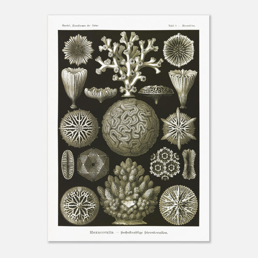 Les figures de cette planche représentent exclusivement les squelettes calcifiés des coraux à six rayons ou polypes florifères, dont les tissus mous vivants ont été retirés. La plupart des figures montrent des colonies individuelles; les figures 1, 8 et 9 représentent des colonies ou des structures formées de nombreuses polypes individuels ou zoïdes. Les hexacorallia constituent un ordre diversifié au sein de la grande classe des animaux coralliens, qui habitent principalement les mers. La planche présente une sélection de ces coraux à six rayons, montrant uniquement leur squelette interne blanc. La couverture charnue colorée qui recouvre ce squelette vivant de corail est absente. Comme les autres Anthozoaires, les Hexacorallia vivent soit individuellement sous forme de polypes isolés, soit regroupés en colonies ou en structures. Chaque polype individuel présente une forme géométrique de base d'une pyramide à six faces; la base hexagonale de celle-ci est illustrée dans les figures 2, 3, 6, 7, 14, 15. Au centre se trouve la bouche, qui conduit directement dans la cavité gastrique. À partir de cette cavité gastrique rayonnent des compartiments stomacaux radiaux ou des septes, qui sont souvent très diversifiés dans leur disposition et leur forme. En général, on distingue six grands rayons primaires (méridiens principaux ou perradiens) et six rayons secondaires plus petits (interradiens ou interméridiens), situés entre ceux-ci se trouvent souvent douze rayons tertiaires plus fins (rayons adradiens ou sous-méridiens). En vue latérale, le polype corallien individuel peut apparaître soit plat, en forme de disque (figure 2a, 14a), soit élevé, en forme de colonne (figures 4, 5). Le polype ou zoïde est généralement fixé au fond marin avec son pôle inférieur orienté vers la bouche. Les colonies ou structures des Hexacorallia, souvent composées de nombreux zoïdes ou polypes étroitement liés, sont formées à partir d'un zoïde originel par bourgeonnement répété ou division incomplète. Leur alimentation repose sur une coopération totale; toute la nourriture absorbée par les zoïdes individuels à travers la bouche et digérée dans leur cavité gastrique est redistribuée à travers des canaux alimentaires ou gastrodermes qui traversent toute la colonie. La forme et la taille de ces structures coralliennes varient considérablement; elles peuvent être ramifiées comme des arbres (figure 1), arbustives (figure 9), en forme de vase ou même de fouet (figure 8). Les Hexacorallia développés forment de vastes récifs dans les mers tropicales grâce à leur croissance massive. Ces récifs fossilisés des périodes géologiques antérieures sont souvent bien préservés, souvent si beaux que l'on peut distinguer tous les détails de leur structure squelettique délicate aussi bien que sur les coraux vivants. De grandes masses montagneuses sont parfois entièrement composées de coraux fossilisés, comme le célèbre "calcaire à coraux" du Jurassique supérieur (blanc).
