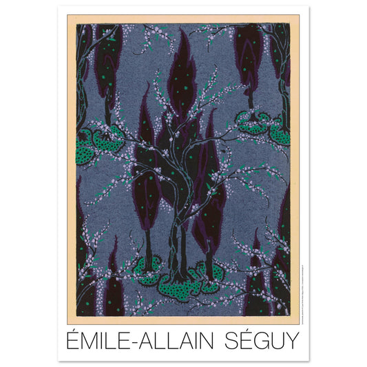 La planche n°2 du recueil *Samarkande* d’Émile-Allain Séguy présente une composition végétale stylisée, inspirée de l’art oriental et du vocabulaire décoratif Art Déco. Sur un fond bleu-gris texturé, des arbres aux branches sinueuses s’élèvent, ornés de délicates fleurs en bourgeons de couleur lavande. Ces arbres, probablement des amandiers ou des cerisiers en floraison, contrastent avec la verticalité imposante des cyprès sombres en arrière-plan, dont les cimes effilées rappellent les paysages persans ou ottomans. Des touffes de verdure parsemées de pois verts ponctuent la base des troncs, ajoutant du relief et un effet ornemental raffiné. Cette composition, caractérisée par une élégance graphique et une palette de couleurs sophistiquée, illustre l’attrait de Séguy pour les motifs naturalistes réinterprétés dans un esprit décoratif. Elle évoque à la fois la luxuriance des jardins orientaux et la modernité des arts décoratifs du début du XXe siècle.
