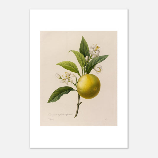 Oranger à Fruits Déprimés est une illustration qui capture la majesté de cet arbre fruitier avec ses fruits distinctifs et ses feuilles luxuriantes. Pierre-Joseph Redouté, célèbre illustrateur botanique du XVIIIe siècle, dépeint avec précision la beauté naturelle de l'oranger à travers ses gravures.