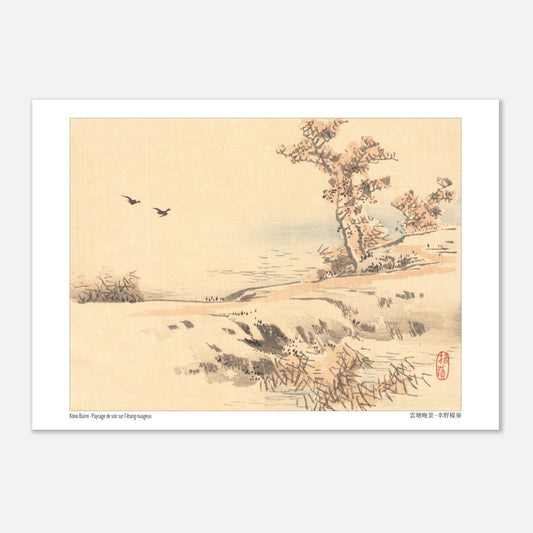 Dessin faune et flore représentant la sérénité et l'équilibre de la nature japonaise - Paysage de soir sur l'étang nuageux de Kōno Bairei