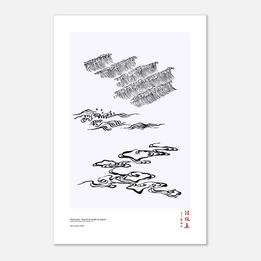 Plongez dans l’élégance intemporelle de l’art japonais avec cette reproduction du motif N°31 extraite du volume intermédiaire (中) du Hamonshū, un recueil emblématique réalisé en 1903 par Mori Yūzan. Le titre original (波紋集), signifiant littéralement « Recueil de motifs de vagues », cette collection met en lumière un thème universel : le mouvement fluide et harmonieux de l’eau et des formes qui l’évoquent. Conçu pour guider les artisans dans l’ornementation de leurs créations, Hamonshū regroupe des motifs variés, allant d’ondulations abstraites à des compositions plus figuratives, parfois proches du paysage, toujours empreintes de poésie et d’une maîtrise esthétique exceptionnelle.