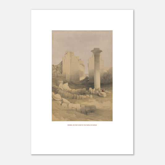 Découvrez la majesté troublante du dromos, ou premier cour du temple de Karnak, figée dans sa grandeur déchue. Cette gravure illustre le contraste frappant entre l’immensité passée de cette avenue colossale de colonnes et l’état actuel de ruine. Bien que seulement une colonne soit encore debout, elle nous permet d'imaginer l’ampleur de la splendeur qui régna autrefois ici, entre les deux propyla majestueux menant à la grande salle des colonnes.
