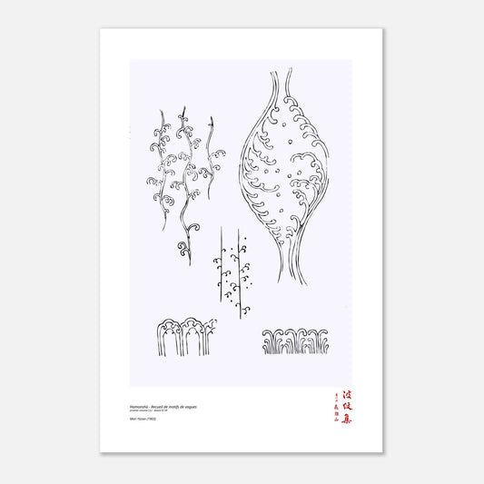 Plongez dans l’élégance intemporelle de l’art japonais avec cette reproduction du motif N°39 extraite du premier volume (上) du Hamonshū, un recueil emblématique réalisé en 1903 par Mori Yūzan. Le titre original (波紋集), signifiant littéralement « Recueil de motifs de vagues », cette collection met en lumière un thème universel : le mouvement fluide et harmonieux de l’eau et des formes qui l’évoquent. Conçu pour guider les artisans dans l’ornementation de leurs créations, Hamonshū regroupe des motifs variés, allant d’ondulations abstraites à des compositions plus figuratives, parfois proches du paysage, toujours empreintes de poésie et d’une maîtrise esthétique exceptionnelle.
