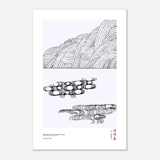 Faites entrer la poésie de l’art japonais dans votre espace avec cette reproduction du motif N°49 tirée du volume intermédiaire (中) du Hamonshū, le célèbre recueil de motifs réalisé en 1903 par Mori Yūzan. Le titre (波紋集), qui peut être traduit par « Recueil de motifs de vagues », met en avant un thème universel : la fluidité et l’harmonie des formes inspirées de l’eau. Destiné à guider les artisans, ce recueil regorge de compositions variées, allant de vagues abstraites à des paysages stylisés, toujours empreintes de sensibilité et de raffinement.