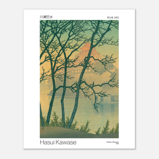 Estampe artistique mêlant tradition artistique japonaise et sensibilité moderne - Château d'Okayama par Hasui Kawase