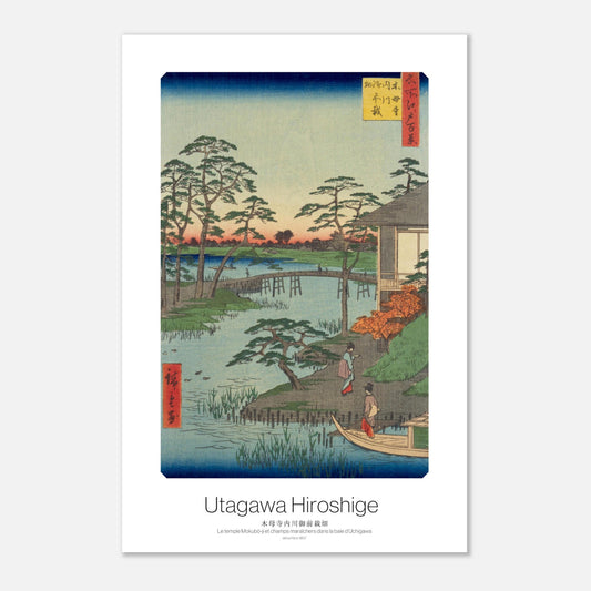 Estampe traditionnelle Représentant la sérénité et l'équilibre des paysages japonais - Le temple Mokubō-ji et la baie d'Uchigawa de Hiroshige