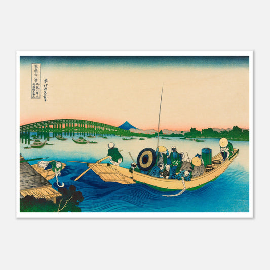 Coucher de soleil à travers le pont de Ryōgoku depuis la rive de la Sumida à Onmayagashi (御厩川岸ゟ両國橋夕陽見, Ommayagashi yori ryōgoku-bashi yūhi mi) est une estampe japonaise réalisée par l'artiste japonais spécialiste de l'ukiyo-e Katsushika Hokusai. Cette œuvre capture un moment magique où le soleil se couche derrière le pont de Ryōgoku, illuminant le ciel et se reflétant sur les eaux du fleuve Sumida. Le mont Fuji, discret mais omniprésent, forme un contraste doux avec la scène animée de la ville.