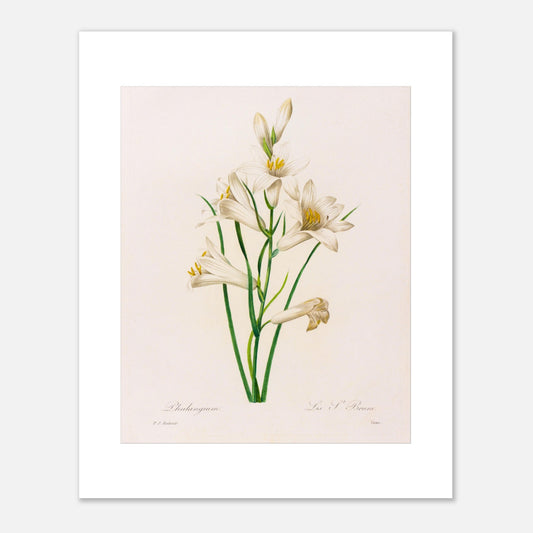 Phalangium (Lys Saint-Bruno) est une illustration qui capture la majesté de cette fleur avec ses pétales délicats et ses couleurs vibrantes. Pierre-Joseph Redouté, célèbre illustrateur botanique du XVIIIe siècle, dépeint avec précision la beauté naturelle du lys Saint-Bruno à travers ses gravures.