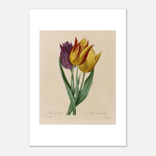 Tulipe de Gesner est une illustration qui capture la vivacité de cette fleur avec ses pétales délicats et ses couleurs vibrantes. Pierre-Joseph Redouté, célèbre illustrateur botanique du XVIIIe siècle, témoigne de son talent pour capturer la beauté et la diversité des fleurs à travers ses gravures.