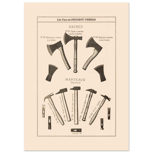 Retour vers les outils robustes et durables du XIXe siècle avec cette reproduction d'une planche originale du catalogue Les Fils de Peugeot Frères (1885). Cette illustration met en lumière des haches et marteaux tout acier, conçus pour les travaux les plus exigeants.