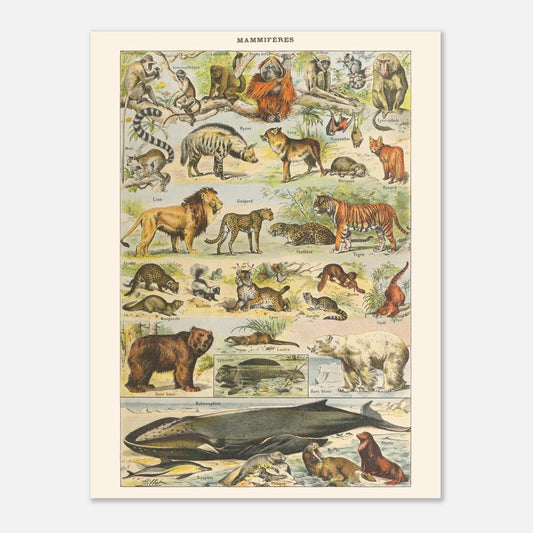 Cette belle illustration ancienne consacrée aux mammifères sauvages provient de l’Encyclopédie Larousse pour tous, édition de 1910. On y découvre une diversité impressionnante d’espèces — baleine, ours, lion, loups et singes — représentées avec une précision naturaliste remarquable. La composition, fidèle à l’originale, traduit l’équilibre entre rigueur scientifique et esthétique d’époque.