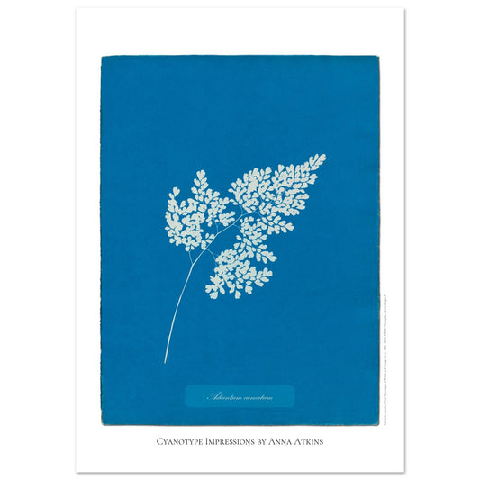 Plongez dans l’élégance intemporelle du cyanotype avec cette reproduction fidèle d’une photographie de Adiantum cuneatum, réalisée selon la technique pionnière d’Anna Atkins. Tiré de son ouvrage historique *Cyanotypes of British and Foreign Ferns*, ce tirage restitue la finesse des formes végétales et la profondeur du bleu de Prusse caractéristique, témoignant du mariage entre art et science qui animait cette botaniste et photographe du XIXe siècle. Chaque détail de la fougère se détache avec une précision remarquable, capturant l’essence des premières expérimentations photographiques dédiées à l’étude du monde naturel.