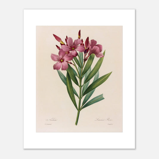 Laurier Rose (Nerium) est une illustration qui capture la magnificence de cette plante avec ses fleurs délicates et ses feuilles luxuriantes. Pierre-Joseph Redouté, célèbre illustrateur botanique du XVIIIe siècle, dépeint avec précision la beauté naturelle du laurier-rose à travers ses gravures.
