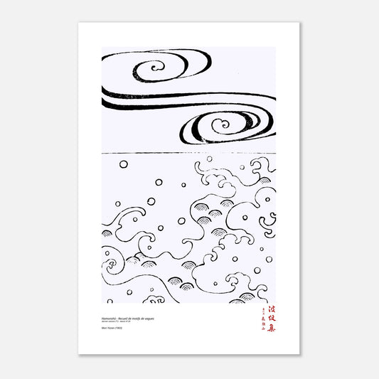 Explorez la richesse de l’art japonais avec cette reproduction du dessin N°29 tirée du dernier volume (下) du Hamonshū, un recueil de référence réalisé en 1903 par Mori Yūzan. Le titre original (波紋集), signifiant littéralement « Recueil de motifs de vagues », met à l’honneur l’élégance des formes fluides et harmonieuses inspirées par l’eau. Conçu pour les artisans, ce recueil rassemble des motifs variés, des ondulations abstraites aux compositions évoquant des paysages, exprimant toujours une poésie visuelle et un sens aigu de l’équilibre esthétique.