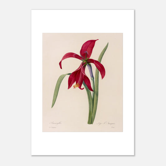 Amaryllis Formosissima illustre avec précision et élégance cette variété magnifique d'amaryllis. Pierre-Joseph Redouté, célèbre illustrateur botanique du XVIIIe siècle, montre une fois de plus sa capacité à rendre hommage à la beauté naturelle des plantes à travers son art raffiné.