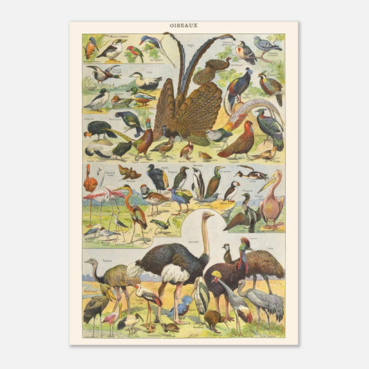 Plongez dans l’univers varié des oiseaux avec cette planche ancienne tirée de l’Encyclopédie Larousse pour tous publiée en 1910. Elle rassemble une grande diversité d’espèces, comprenant martins, canards et autres faisans, lyres, ainsi que des oiseaux plus exotiques comme flamants, manchots, pélicans, sans oublier autruches, émeus et spatules. Chaque espèce est représentée avec une précision naturaliste et une finesse graphique qui rendent hommage à l’art des illustrateurs de l’époque.