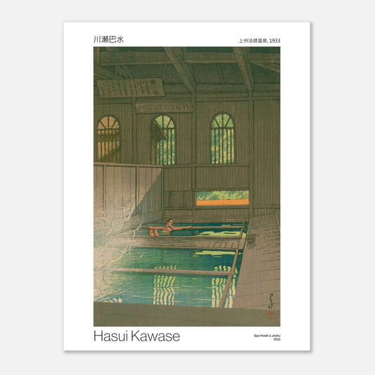 Spa Hoshi à Joshu évoque une scène paisible où l'eau chaude des sources thermales invite à la détente. Les couleurs douces et les détails subtils créent une atmosphère de sérénité, célébrant la beauté des espaces de bien-être japonais. Cette estampe capture l'essence du repos et de la relaxation.