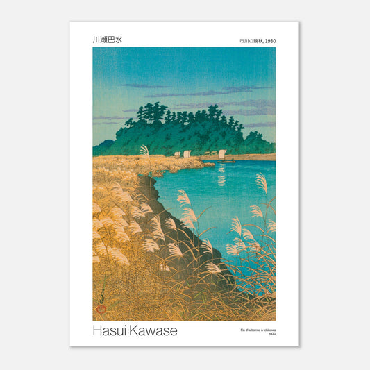 Reproduction de l'estampe «Fin d'automne à Ichikawa» réalisée par Hasui Kawase en 1930 (titre original : «市川の晩秋»
