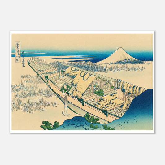 Dans cette œuvre des Trente-six vues du mont Fuji, Hokusai explore le lien profond entre l’homme, l’eau et la terre. L'estampe illustre une coexistence paisible entre les activités humaines et la splendeur naturelle de la région.