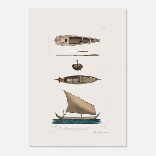 Cette œuvre s’inscrit dans le cadre du voyage de l’Astrolabe (1826-1829) sous la direction de Dumont d’Urville, une expédition emblématique de l’exploration scientifique et ethnographique française. Ce périple n’était pas sans dangers : les hommes de l’Astrolabe affrontèrent tempêtes, récifs, maladies, et même des tensions avec les populations locales, parfois marquées par des échanges hostiles. C’est dans cet environnement éprouvant que François Edmond Pâris, jeune officier de marine et dessinateur talentueux, a immortalisé les embarcations rencontrées, oscillant entre préjugés culturels et fascination pour l’ingéniosité technique. Ces dessins sont ainsi devenus des témoignages uniques des traditions maritimes et des modes de vie des peuples du Pacifique, examinés avec un regard mêlant science et sensibilité.