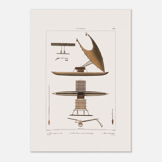 Découvrez cette reproduction des pirogues et radeau à balancier de Tévai, observés par François Edmond Pâris lors de son passage à Vanikoro. Ces embarcations, caractéristiques de la région, sont conçues pour naviguer avec agilité dans les eaux tumultueuses de l'archipel. Les pirogues, dotées de balanciers astucieux, assurent une grande stabilité, tandis que le radeau, plus rudimentaire, témoigne de l'ingéniosité des habitants dans la création de solutions maritimes adaptées à leur environnement. Chaque détail de ces embarcations reflète le savoir-faire des peuples de Tévai, illustrant leur maîtrise des défis marins et leur relation intime avec l’océan.