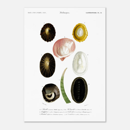 Reproduction gravure de : Dentale éléphantine (Dentalium elephantinum, Martini), Oscabrion écailleux (Chiton squamosus, Lin.), Patelle commune (Patella vulgata, Lin.), Fissurelle en bateau (Fissurella nimbosa, Lamk.), Cabochon bonnet hongrois (Pileopsis hungarica, Lamk.), Calyptrée scabre (Calyptraea equestris, Lamk.)