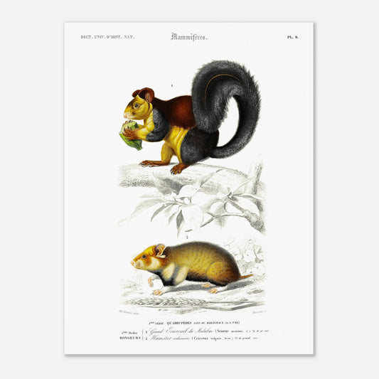 Reproduction gravure de : Grand Écureuil du Malabar (Sciurus maximus, Lin.), Hamster ordinaire (Cricetus vulgaris, Desm.)