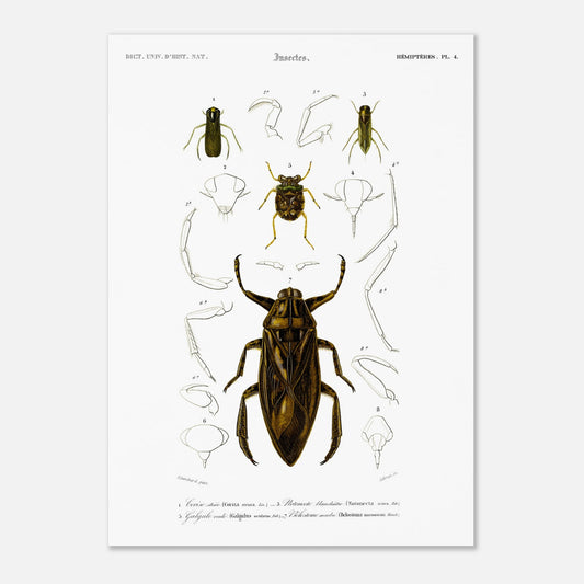 Reproduction gravure de : Corise striée (Corisa striata, Lin.), Notonecte blanchâtre (Notonecta nicea, Fabr.), Tête vue de face du Notonecte glauque (Notonecta glauca, Lin.), Galguleoculé (Galgulus oculatus, Fabr.), Tête vue de face du Naucore cimicoïde (Naucoris cimicoides, Lin.), Bélostome marbré (Belostoma marmoratum, Blanch.), Tête de la Nèpe cendrée (Nepa cinerea, Lin.)