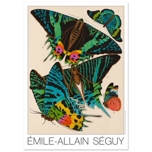 Redécouvrez le monde somptueux des papillons à travers une reproduction élégante d’une planche d’Émile-Allain Séguy, maître de l’illustration décorative. Chaque espèce exotique, sélectionnée pour son raffinement et la richesse de ses couleurs, est ici magnifiée par un agrandissement exceptionnel, rendant visibles les plus infimes détails de leurs ailes délicates. Conçu comme un trésor pour les artistes et amateurs de design, ce recueil rassemble des spécimens dont les formes et harmonies chromatiques inspirent depuis plus d’un siècle les créateurs de motifs décoratifs. Loin d’une simple étude scientifique, ces compositions sont pensées comme une célébration de la beauté naturelle dans sa plus pure expression. Cette reproduction raffinée est une pièce unique pour orner un intérieur avec élégance. Idéale pour les collectionneurs et passionnés d’ornementation, elle incarne l’union parfaite entre art et nature.La liste des espèces présentes dans la planche ainsi que leur provenance