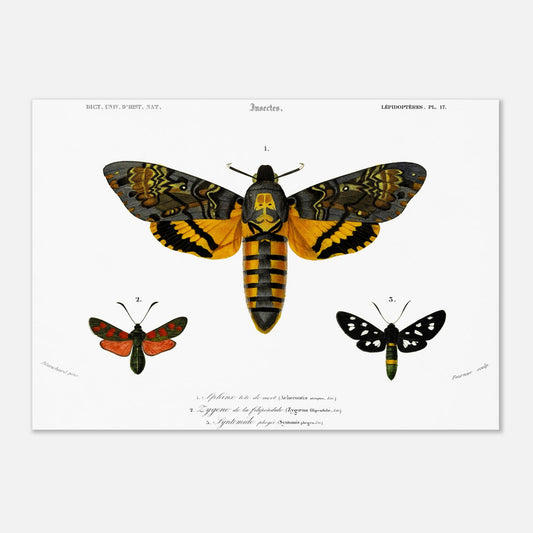 Note importante : les éléments scientifiques de classification de l'époque ont été conservés tels quels et peuvent bien entendu être obsolètes aujourd'hui. Le nom actuel de l'individu représenté en Fig.1 est Sphinx tête de mort (Acherontia atropos), de l'individu représenté en Fig. 2 est Zygène du pied-de-poule (Zygaena filipendulae) et de l'individu représenté en Fig. 3 est Sphinx du pissenlit (Amata phegea)