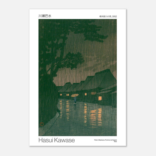 Reproduction de l'estampe «Pluie à Maekawa, Province de Sagami» réalisée par Hasui Kawase en 1932 (titre original : «相州前川の雨»