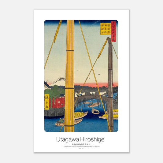 Ce pont, au centre de l'image, relie le sanctuaire Minato-jinja du côté gauche aux maisons blanches des entrepôts portuaires du côté droit. Cette représentation détaillée de l'activité portuaire reflète l'importance économique et commerciale d'Edo à l'époque d'Hiroshige. La baie d’Edo, bien que peu profonde, est le point central de toute l'activité maritime, où les bateaux déchargent leurs marchandises pour les stocker dans les hangars le long des rives. En arrière-plan, la silhouette majestueuse du mont Fuji se dresse, rappelant la présence constante de la nature dans le paysage urbain animé. Cette juxtaposition de l'activité humaine et de la grandeur naturelle est une caractéristique récurrente de l'œuvre d'Hiroshige.