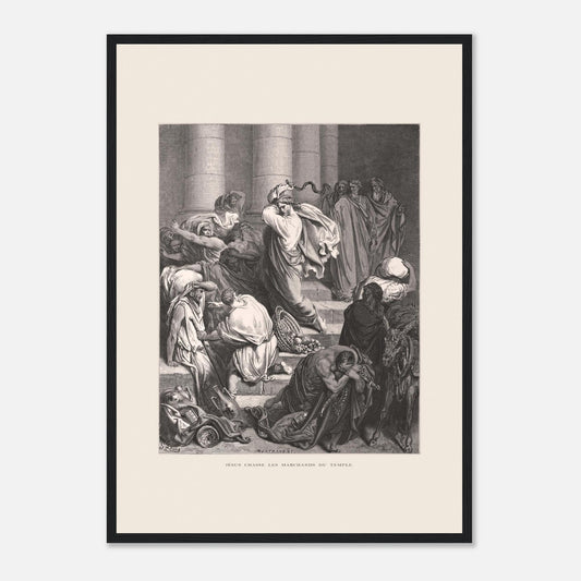 Cette estampe incarne le talent de Doré pour les scènes de justice et de purification, où chaque élément renforce la dimension morale et spirituelle. La référence biblique, Saint Marc XI, 15, évoque la colère juste et la sanctification.