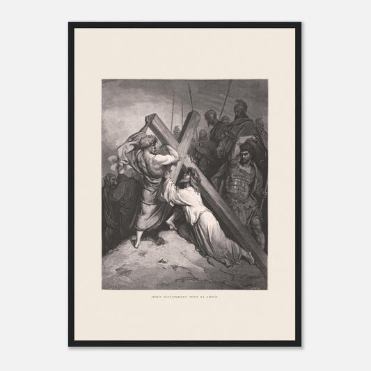 Laissez-vous toucher par cette gravure émouvante de Gustave Doré, représentant Jésus succombant sous sa croix, tirée de La Sainte Bible selon la Vulgate (1866). Les détails de la croix, des blessures et de l'expression de fatigue de Jésus illustrent le Saint Luc XXIII, 25 avec une compassion profonde.