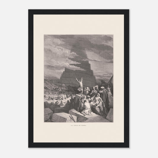Découvrez cette gravure saisissante de Gustave Doré, illustrant la construction de la tour de Babel, tirée de La Sainte Bible selon la Vulgate (1866). Les détails architecturaux monumentaux et la confusion des ouvriers captent toute la puissance symbolique de la Genèse XI, 4, évoquant l'orgueil humain et la diversité des langues.