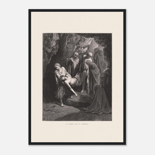 Contemplez cette illustration solennelle de Gustave Doré, représentant le Christ mis au tombeau, tirée de La Sainte Bible selon la Vulgate (1866). Les détails du linceul, des visages attristés et de la pierre du tombeau illustrent le Saint Jean XIX, 41 avec une gravité sacrée.
