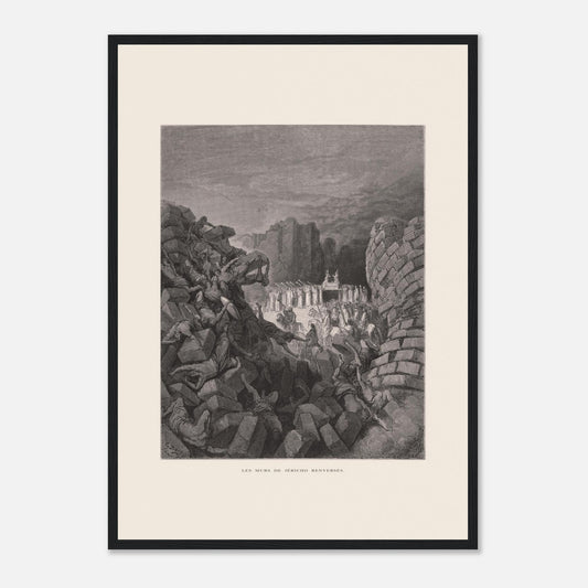 Découvrez cette gravure spectaculaire de Gustave Doré, représentant la chute des murs de Jéricho, tirée de La Sainte Bible selon la Vulgate (1866). Les détails des murs qui s'effondrent et les expressions de surprise des soldats illustrent le Josué VI, 6 avec un réalisme saisissant.