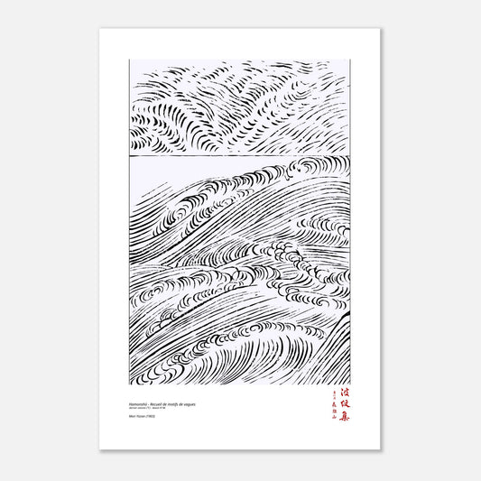 Explorez la richesse de l’art japonais avec cette reproduction du dessin N°46 tirée du dernier volume (下) du Hamonshū, un recueil de référence réalisé en 1903 par Mori Yūzan. Le titre original (波紋集), signifiant littéralement « Recueil de motifs de vagues », met à l’honneur l’élégance des formes fluides et harmonieuses inspirées par l’eau. Conçu pour les artisans, ce recueil rassemble des motifs variés, des ondulations abstraites aux compositions évoquant des paysages, exprimant toujours une poésie visuelle et un sens aigu de l’équilibre esthétique.
