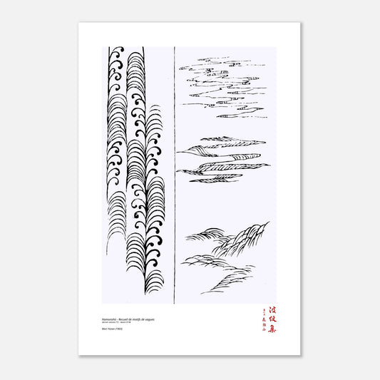 Faites entrer la poésie de l’art japonais dans votre espace avec cette reproduction du motif N°48 tirée du dernier volume (下) du Hamonshū, le célèbre recueil de motifs réalisé en 1903 par Mori Yūzan. Le titre (波紋集), qui peut être traduit par « Recueil de motifs de vagues », met en avant un thème universel : la fluidité et l’harmonie des formes inspirées de l’eau. Destiné à guider les artisans, ce recueil regorge de compositions variées, allant de vagues abstraites à des paysages stylisés, toujours empreintes de sensibilité et de raffinement.