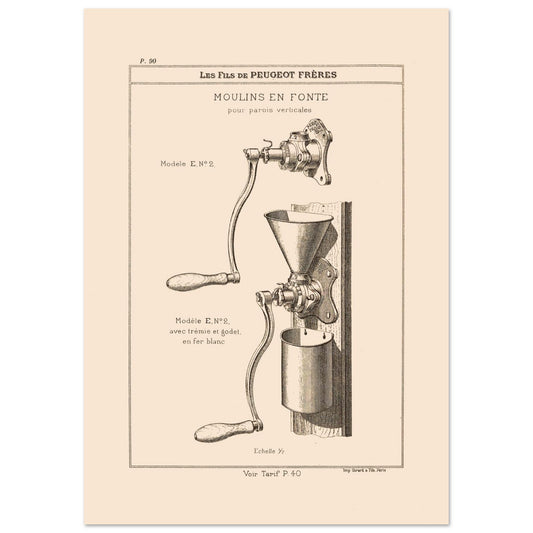 Retrouvez le charme des cuisines traditionnelles avec cette reproduction d'une planche originale du catalogue Les Fils de Peugeot Frères (1885). Cette illustration présente des moulins en fonte pour parois verticales, des accessoires robustes et pratiques qui ornaient les cuisines de nos grands-mères. Ces moulins, avec leurs mécanismes en laiton et leurs finitions en fer blanc, évoquent les saveurs et les traditions culinaires d'autrefois.